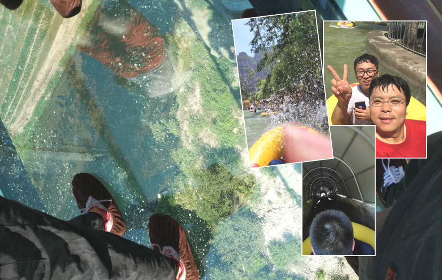 第二天的活動是爬山玻璃棧道和高山漂流。第一個(gè)項(xiàng)目是爬山,先是沿著細(xì)水長流的小溪向上爬,還比較涼爽,頂著烈日爬山也是一件很有挑戰(zhàn)的事情,機(jī)智的小伙伴早就帶好了防曬衣、帽子、墨鏡,爬到山頂有一個(gè)圓形玻璃橋,從山上看風(fēng)景真是一種享受,在城市里待久,呼吸一下山上的空氣都是一種享受。