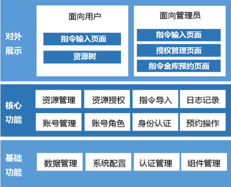 系統(tǒng)對(duì)外展示采用分權(quán)方式針對(duì)于管理員和普通用戶提供不同的操作內(nèi)容,前端使用JSP集成SSH客戶端技術(shù),使用樹形結(jié)構(gòu)對(duì)后臺(tái)授權(quán)資源的展示,另外頁(yè)面中提供一些操作按鈕,對(duì)于常用命令和快捷操作,可以通過按鈕的方式快速下發(fā)。